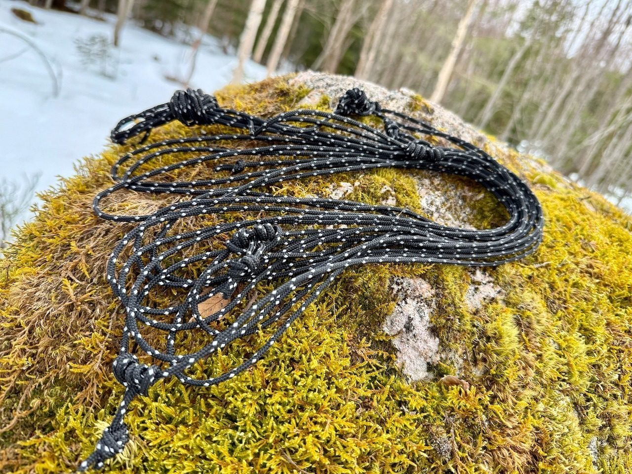 Our ridgeline includes 10 meters of 3 mm reflective nylon cord. Each end features two prusik knots—easy to adjust when loose, rock solid when tensioned.